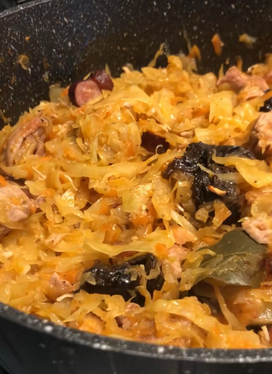 Вливаємо у велику каструлю олію, вкидаємо нарізане кубиками середнього розміру м’ясо. Обсмажуємо близько 10–12 хв., перемішуючи. Додаємо ковбаски, перемішуючи, смажимо ще 8 хв., потім — мелений перець і коріандр. Додаємо цибулю, моркву, томатну пасту і вливаємо 200 мл води. Перемішуючи, тушкуємо близько 15 хв. Вкидаємо квашену капусту і вливаємо ще трішки води. Тушкуємо 15 хв. Додаємо сиру капусту, вимішуючи, готуємо ще 15 хв. Вливаємо вино, додаємо трішки солі та цукру. Додаємо чорнослив (цілий, не нарізаний) і лавровий лист. Тушкуємо ще 20–25 хв. Слідкуйте, щоб не підгоріло. І готово!