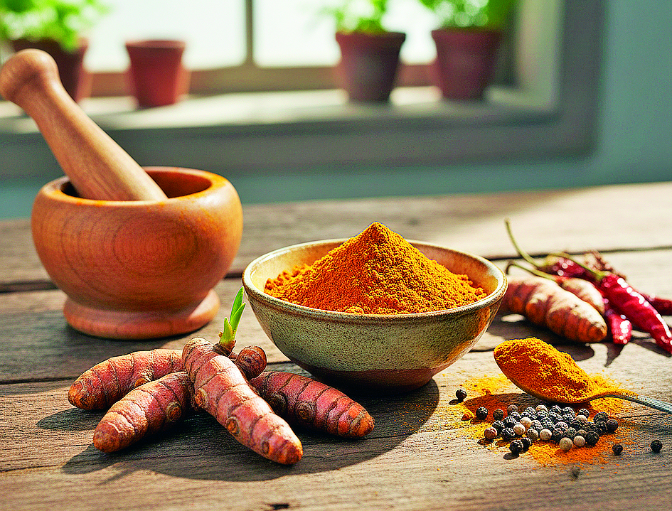 Розчиніть 0,5 ч.л. куркуми та дрібку чорного перцю у склянці теплої води. Пийте натщесерце для стимуляції травлення та протизапальної дії.