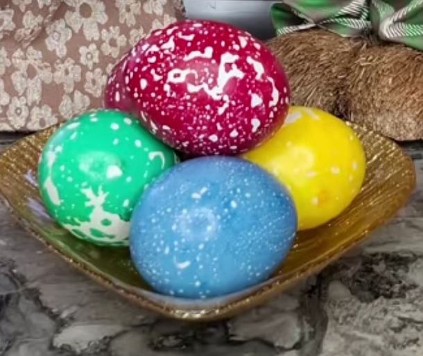 Варимо після закипання ще 10 хв. Залишаємо на ніч або добу в цьому розчині, щоб отримати насичений колір. Готові яйця викладаємо на паперовий рушник і залишаємо до висихання, витирати не потрібно, бо всі кристалики опадуть.