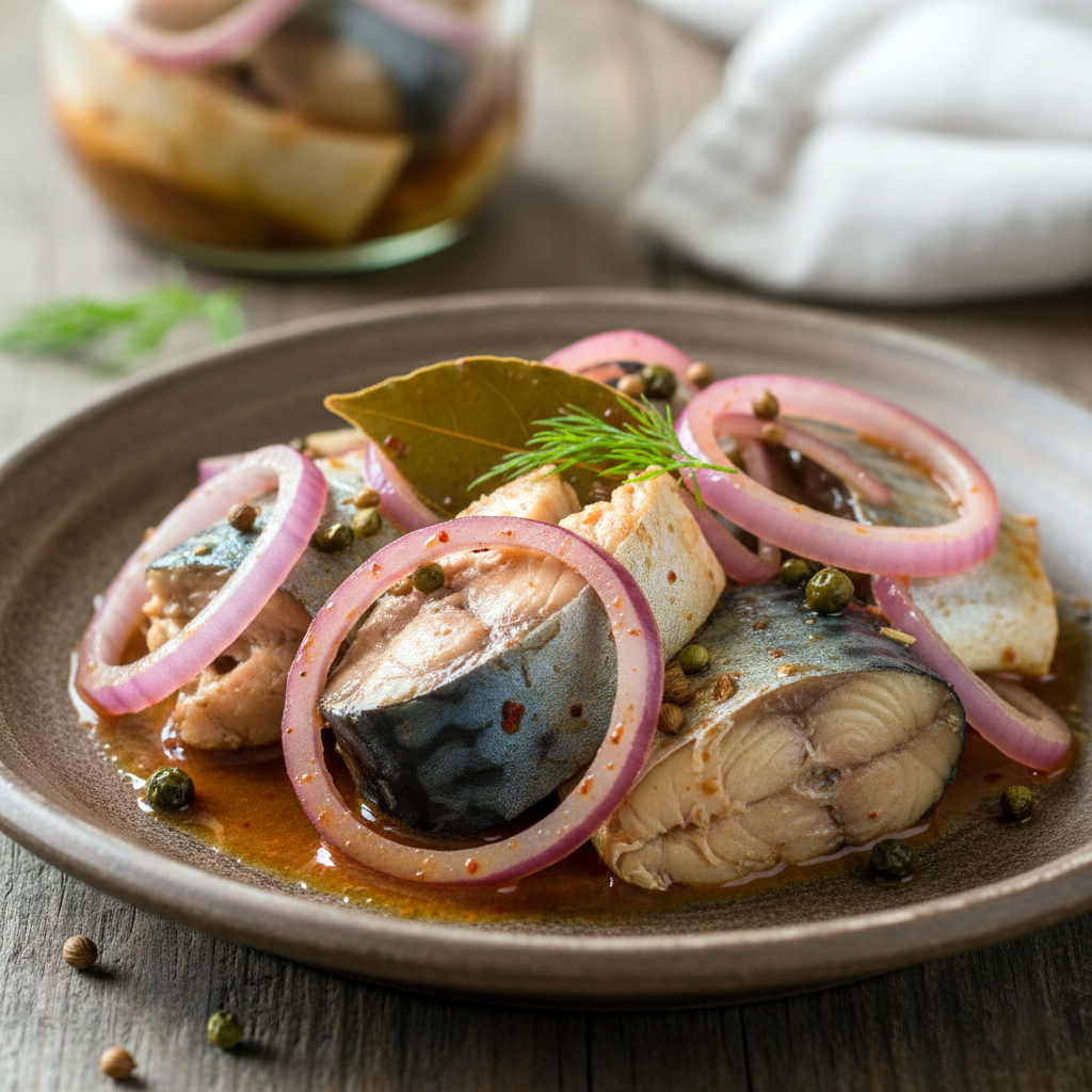У банку викладаємо по черзі: риба, нарізана півкільцями цибуля, і так — доки скінчаться продукти. Заливаємо охолодженим маринадом і накриваємо. Ставимо в холодильник на одну добу. І — смакуємо!