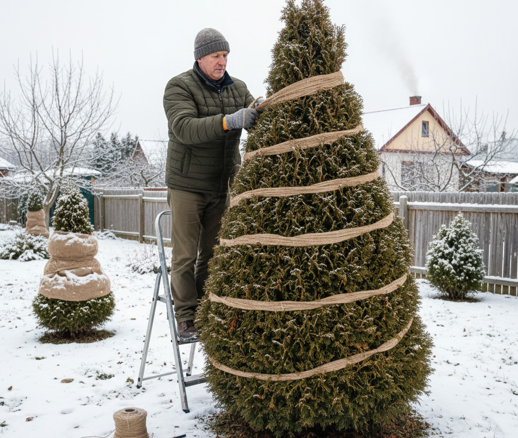 Перед настанням стійких морозів, аби туя в майбутньому мала ошатний вигляд, їй роблять санітарне обрізування. Видаляють сухі, хворі або пошкоджені гілки. Якщо раніше восени не підживили, вносять зараз добрива з високим вмістом фосфору та калію — вони сприятимуть зміцненню кореневої системи та підвищенню зимостійкості. До того, як ґрунт остаточно замерзне, проведіть кілька інтенсивних поливів. Це потрібно для того, щоб корені були насичені вологою перед морозами. Обережно зв’яжіть гілки мотузкою або джгутом, але не занадто туго. Це допоможе уникнути розламування гілок під вагою снігу та захистить форму крони. А для молодих чи нещодавно висаджених деревець краще встановити додаткову опору, щоб захистити від сильного вітру.
