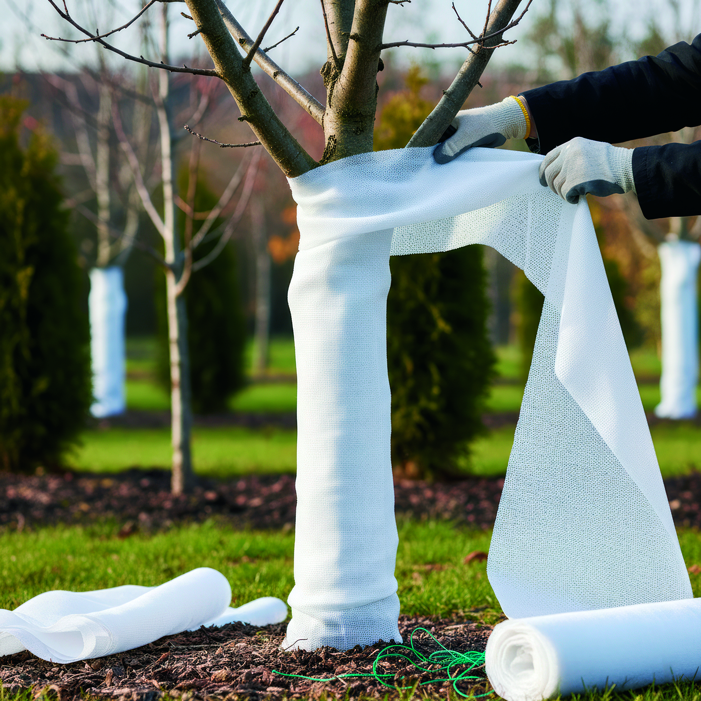 Побілка стовбурів дерев, безперечно, є дуже важливою процедурою. Втім, чи знали ви, що замість побілки дерева можна обмотати білим нетканим матеріалом (агроволокном) або спеціальними садовими бинтами? Це ідеальний варіант для молодих саджанців з ніжною корою, яку вапно може пересушити. На жаль, садоводи рідко беруть до уваги той факт, що дерева до 3 років білити не рекомендується. Крім того, такий захист не змиє дощ.